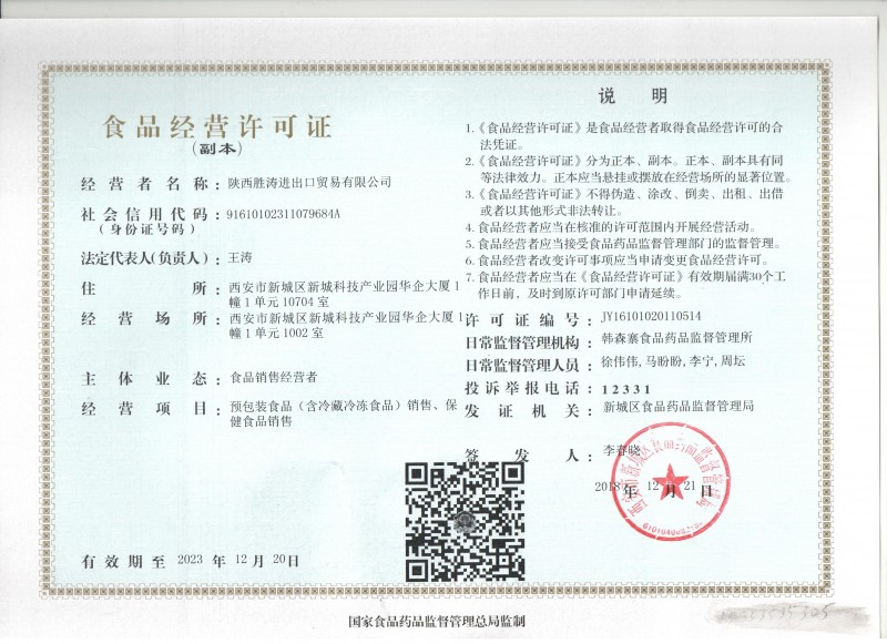 證書(shū)介紹 預(yù)包裝食品(含冷藏冷凍食品)銷(xiāo)售、保健食品銷(xiāo)售