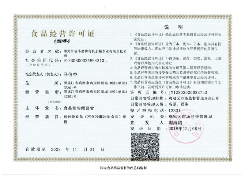 | 發(fā)證機(jī)構(gòu): | 雞冠市市區(qū)監(jiān)督管理局 | 發(fā)證時(shí)間 : | 2018-12-06 |