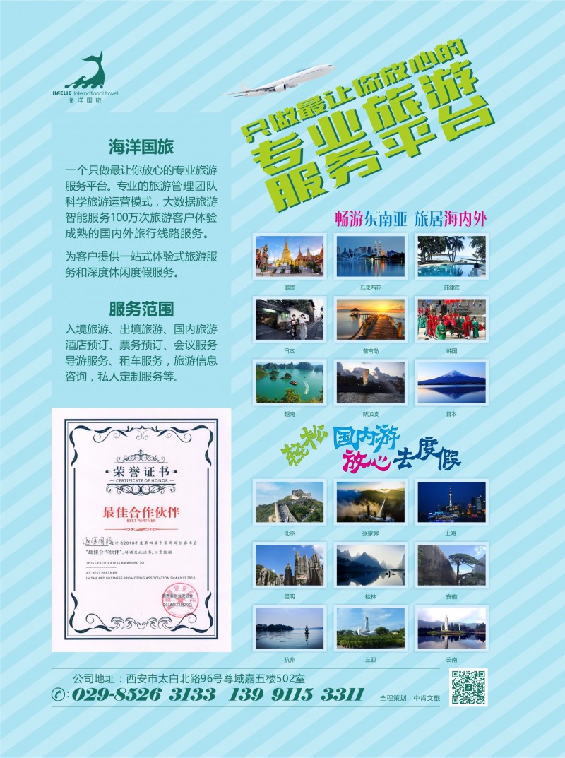 陜西海洋國際旅行社有限公司成立于2017年,具有獨立的法人資格。公司擁有精通旅游專業(yè)的管理人員和高素質(zhì)的工作人員,以科學的管理,合理的價格和優(yōu)質(zhì)的服務受到各界新老朋友的信賴與支持。為客戶提供全方位的體驗式旅游服務以及休閑度假服務:包括入境旅游、出境旅游、國內(nèi)旅游、酒店預訂、票務預訂、會議服務、導游服務、租車服務,旅游信息咨詢,私人定制服務等。
