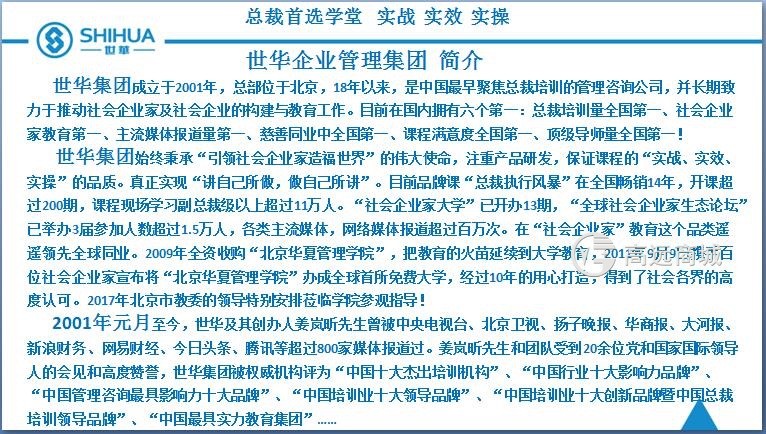 ![]()  世華集團成立于2001年,是中國最早聚焦總裁培訓的管理咨詢公司,并長期致力于推動社會企業(yè)家及社會企業(yè)的構建與教育工作。旗下有總裁班板塊、社會企業(yè)家實修大學、北京華夏管理學院(中國首所免費大學)、云學科技……